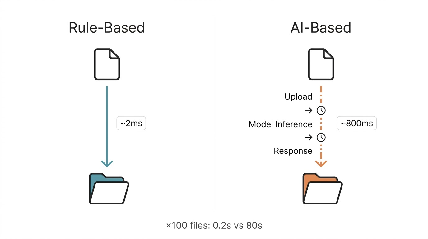 Rule-based file classification handles this in a few milliseconds per file. Checking a file extension and moving it to a designated folder is fundamentally a filesystem operation. An AI-based approach, by contrast, involves a network round trip and model inference time, adding hundreds of milliseconds to several seconds per file. Process a hundred files and that difference becomes immediately apparent.